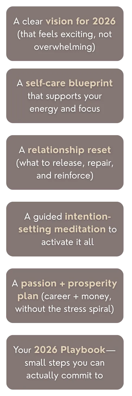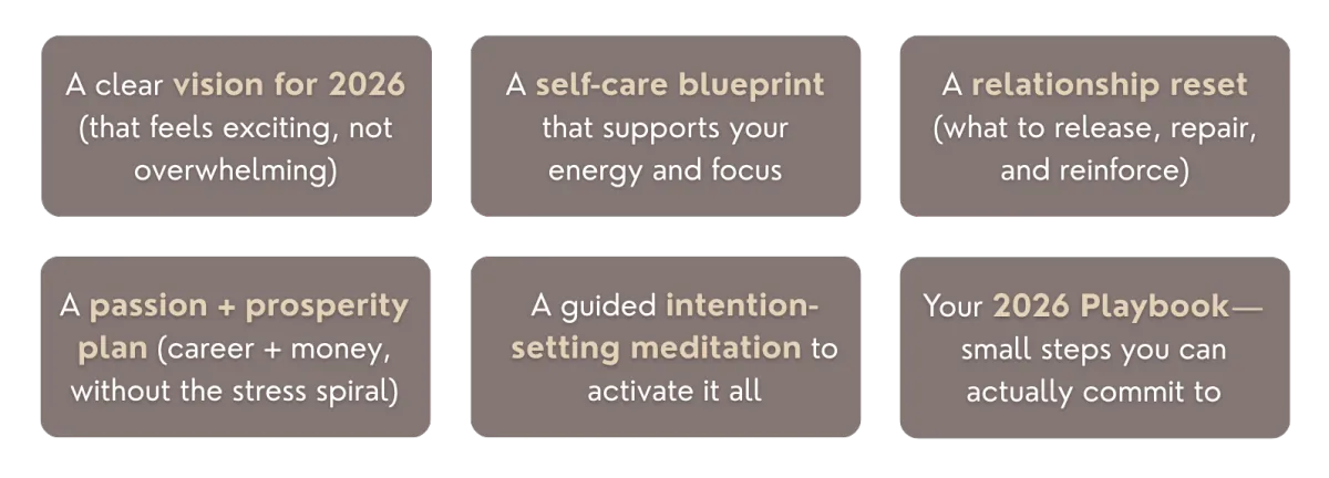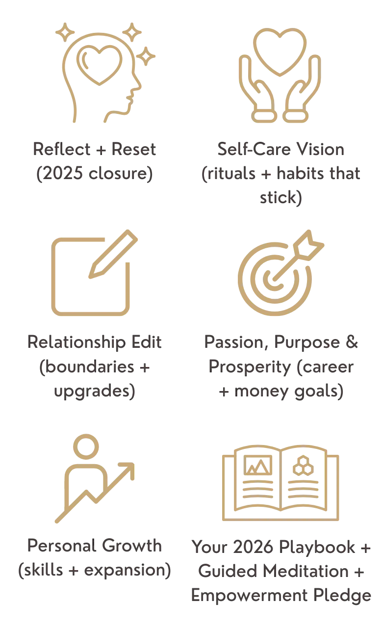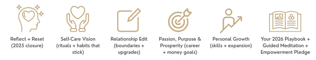 A free 3-hour workshop to turn your 2026 vision into a real plan—across the 6 key areas that shape your life: self-care, relationships, purpose, career, money, and personal growth.